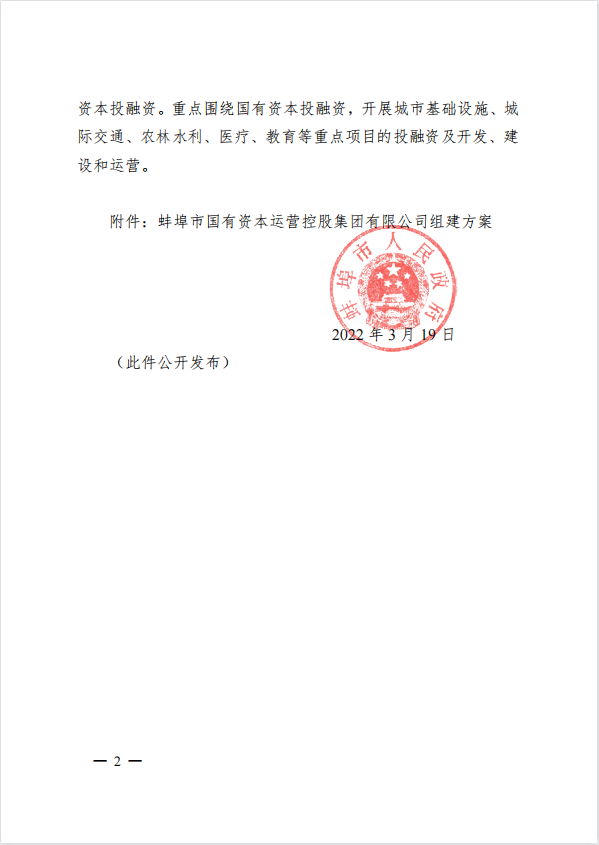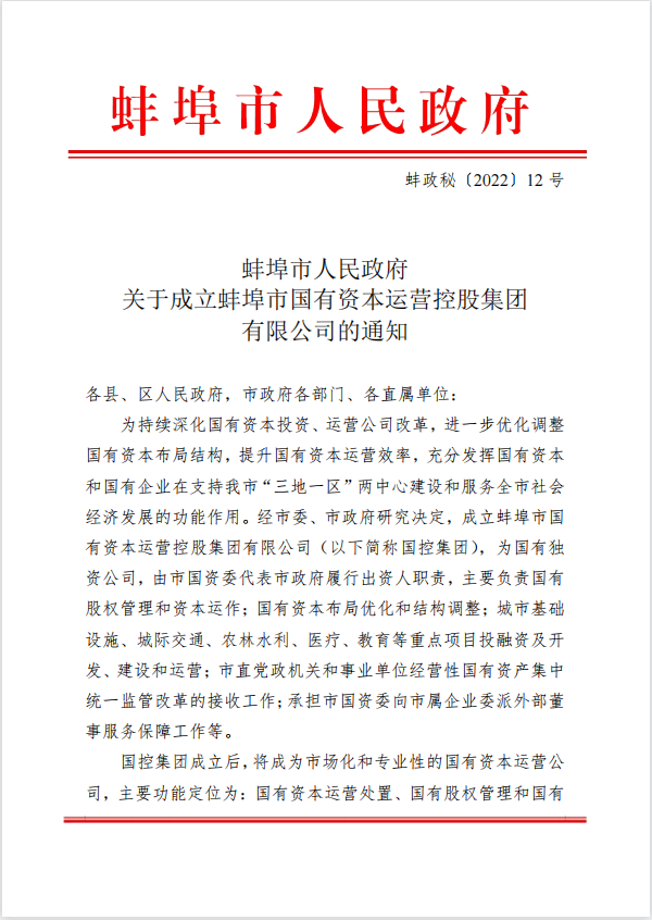 蚌埠市人民政府關(guān)于成立蚌埠市國(guó)有資本運(yùn)營(yíng)控股集團(tuán)有限公司的通知