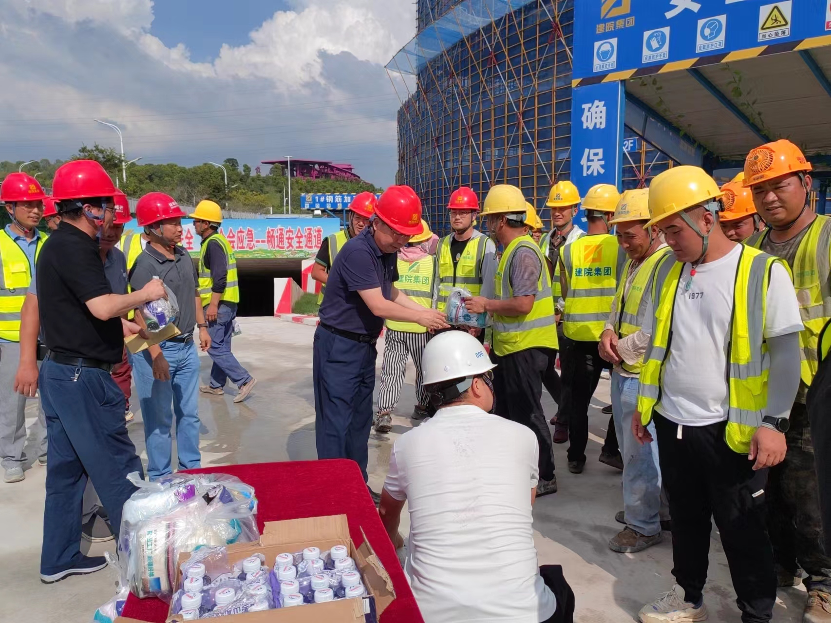 炎炎夏日送清涼,絲絲關(guān)懷暖人心。持續(xù)高溫悶熱天氣,給堅守一線的職工帶來了嚴峻“烤”驗。為切實做好抗高溫防暑降溫工作,有效防控高溫中暑事件和安全生產(chǎn)事故的發(fā)生,切實維護廣大職工的勞動安全和健康權(quán)益,按照市國控集團黨委、市國控集團工會的統(tǒng)一部署,7月25日-7月26日,集團黨委書記、董事長陳建功,黨委副書記、副董事長、總經(jīng)理劉冰,黨委委員、副總經(jīng)理翁暢等分別帶隊走訪慰問了建筑科創(chuàng)中心項目部、新二中站點、幸福河湖項目部、馬城糧庫,為堅守在一線的項目員工送上毛巾、香皂、清涼油等慰問品,對大家的辛苦付出表示感謝,對一線職工不畏高溫、堅守崗位、拼搏奉獻的精神表示贊揚,同時叮囑大家要努力克服高溫天氣帶來的困難和挑戰(zhàn),注意防暑降溫,做好自身防護,確保各項工作安全有序推進。