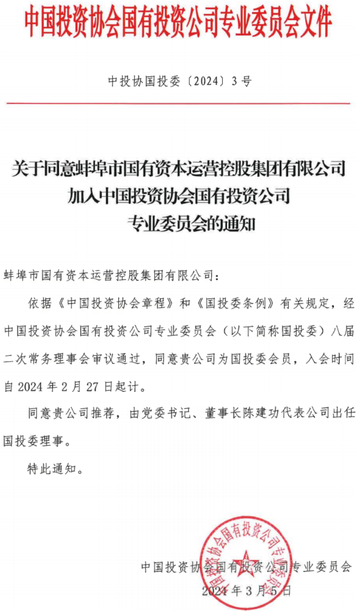 熱烈祝賀蚌埠國控集團加入中國投資協(xié)會國有投資公司專業(yè)委員會